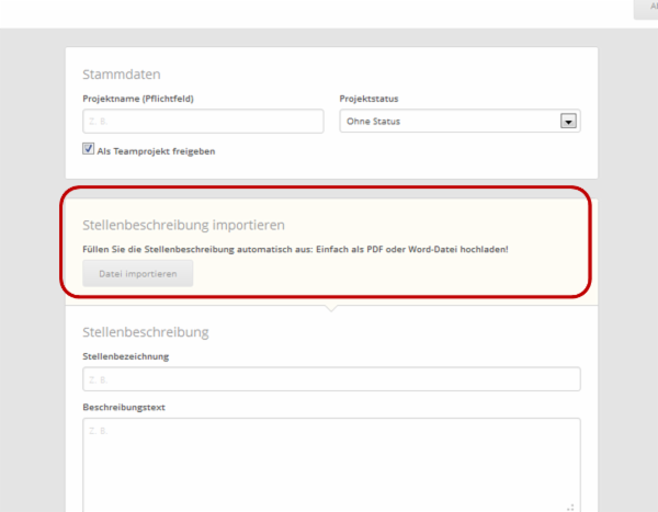 Hier finden sich ähnliche Felder wie im alten Talentmanager. Aber eins ist neu: das Feld „Stellenbeschreibung importieren“. Sehr interessant. Kann es sein, daß Sie jetzt etwa nicht mehr die Felder manuell ausfüllen müssen?