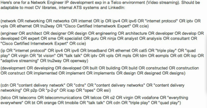 Die Suchketten können auch außerhalb von XING und Linkedin, z.B. direkt in Suchmaschinen genutzt werden. Praktiziert wird dieses Vorgehen in Deutschland erst von einer kleinen Minderheit (unter 10%) der Active Sourcer. Im Gegensatz zu den angelsächsischen Ländern, wo diese Suchform bereits sehr verbreitet ist. Eine komplexe Suchkette für z.B. einen „Network Engineer IP Development“ kann durchaus mal so aussehen: