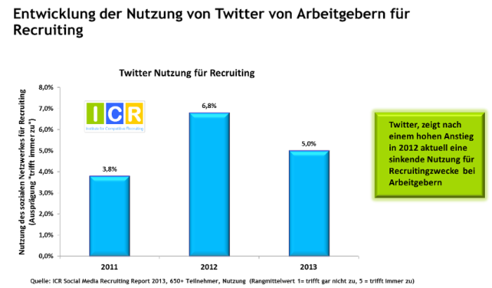 Deutschland, Österreich und die Schweiz tragen mit knapp 10 Mill. Konten und geschätzten 600.000 aktiven Nutzern (Deutschland ca. 350.000) bislang zwar nur mäßig zum internationalen Gezwitscher bei, doch auch hierzulande gewinnt Twitter weiterhin stetig Follower. Die Nutzung von Twitter durch Arbeitgeber für Recruitingzwecke läßt laut aktuellem Social Media Recruiting Report 2013 noch keinen klaren Trend erkennen: