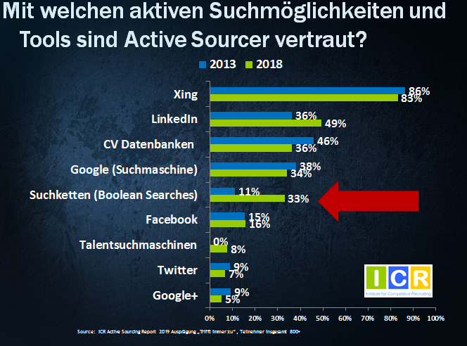 Etwa ein Drittel derjenigen, die Active Sourcing betreiben, nutzen Boolesche Suchen. Diese Zahl hat sich seit 2013 verdreifacht.