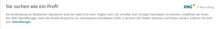Falls Sie zu den besten Active Sourcern gehören, noch keinen Xing Talentmanager haben, und im Premium Account mit Hilfe von Booleschen Operatoren in der erweiterten Suche zu suchen, dann haben Sie in letzter Zeit diese Meldung sicher gesehen: