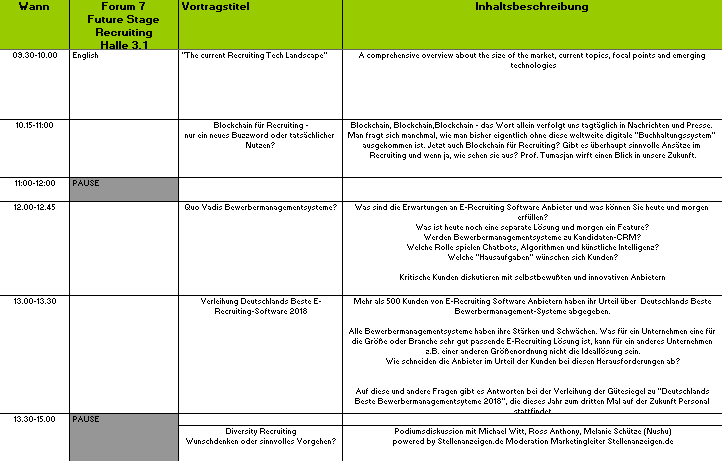 Alle Vorträge etc. finden hier statt: Halle 3.1, Forum 7, Future Stage Recruiting