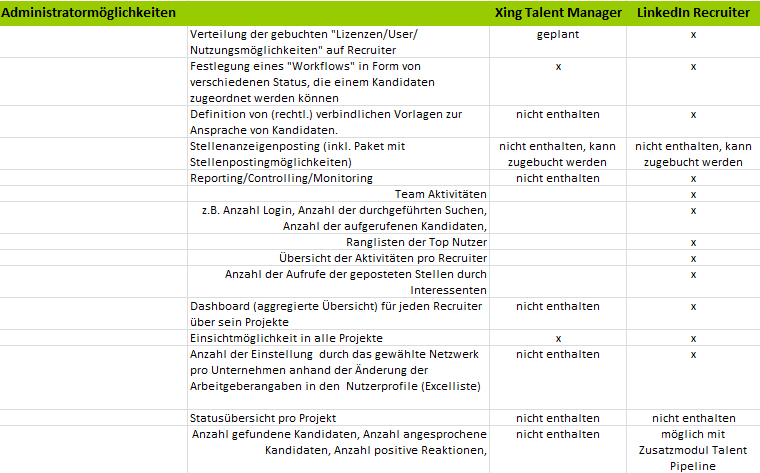 Aus den Angaben, was beim Xing Talentmanager noch fehlt, kann man auch die bessere Ausstattung des Linkedin Recruiter erahnen: Der Linkedin Recruiter bietet ein Online-Controlling über die Aktivitäten der Recruiter, ein Dashboard zur schnellen Übersicht, ein Statusbericht pro Projekt. Einstellende Manager können in den Kandidatenauswahlprozess einbezogen werden und es können Massen-Emails generiert werden, die für den Adressaten wie persönliche Emails aussehen. Es können seitens des Administrators rechtlich verbindliche Vorlagen für den Ansprache ausgewählt werden
