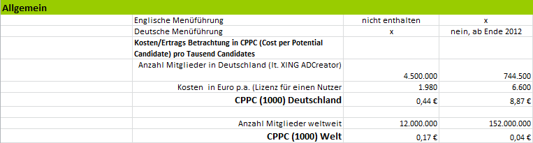 Von der Kosten/Nutzen Betrachtung her liegt der Xing Talentmanager für Deutschland bei ca. 5% der Kosten (0,44 € vs. 8,87 € pro CPPC (1000)) des LinkedIn Recruiters. Insofern ist der Vergleich David gegen Goliath berechtigt. Bei der internationalen Betrachtung kehrt sich der Vergleich um. Für Unternehmen, die an internationalen Kandidaten interessiert sind, liegt Linkedin bei ca. 25 % der Kosten von XING ( (0,04 € vs. 0,17 € pro CPPC (1000)), von den tatsächlichen Recruitingmöglichkeiten aufgrund der unterschiedlichen Länderpräsenz mal ganz abgesehen.