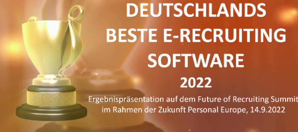 Mehr als 1200 Kunden haben in diesem Betrachtungszeitraum ihre Erfahrungen mit den von Ihnen genutzten Lösungen geteilt und damit die Jury für die renommierten Gütesiegel „Deutschlands beste Bewerbermanagement Software 2022“ gebildet. Auf der diesjährigen HR-Leitmesse „Zukunft Personal Europe“ wurden im Rahmen des Future of Recruiting Summits die Gewinner am 14.9.2022 offiziell in einer live Verleihung ausgezeichnet.