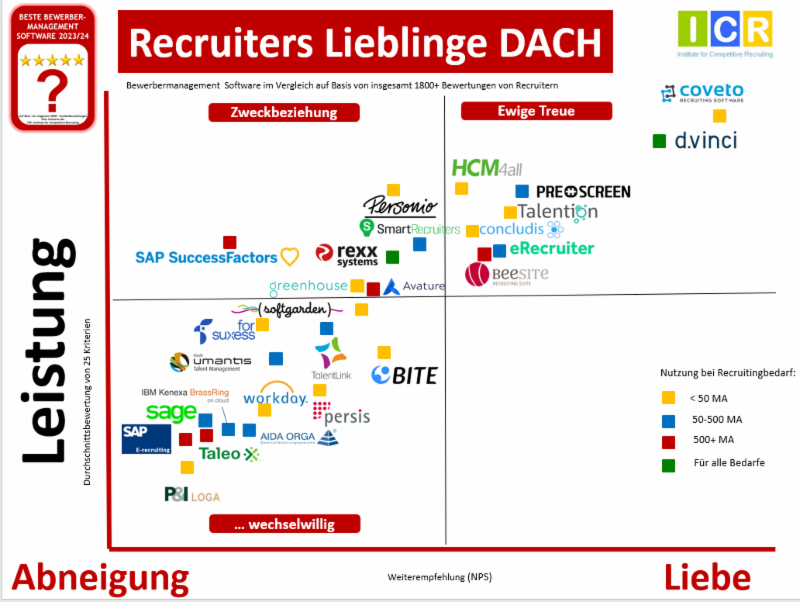 Das Institute for Competitive Recruiting (ICR), Heidelberg hat für diesen Qualitätscheck, den ersten Vergleich seiner Art in Deutschland, in den letzten Jahren jeweils über 20.000 Personaler befragt. Antworten über die Nutzung und die Erfahrungen mit den genutzten Bewerbermanagementsystemen haben zwischen 300-900 Unternehmen angegeben. Mehr als 1200 Kunden von diversen Bewerbermanagementsystem-Anbietern (u.a. SAP E-Recruiting, d.vinci, rexx, Taleo (Oracle), Successfactors, eRecruiter, Persis, Haufe ( Umantis ), Beesite (Milch&Zucker), Talentlink Lumesse, Peoplesoft, P&I LOGA, Concludis, Coveto, Prescreen, Workday, Avature, HCM4ALL) haben für den 2022 /2023 er Report, im Detail eine Beurteilung über die von ihnen genutzte Lösung zum Management von Bewerbern abgegeben. Darüber hinaus haben Sie die Funktionalitäten beurteilt und auch deren Wichtigkeit für die tägliche Nutzung angeben. Insbesondere eine Übersicht über die wichtigsten E-Recruiting Software Lösungen und deren Zufriedenheitsbewertungen durch über 1200 Kunden anhand von 25 Funktionen soll potentiellen Käufern einen Marktüberblick geben.