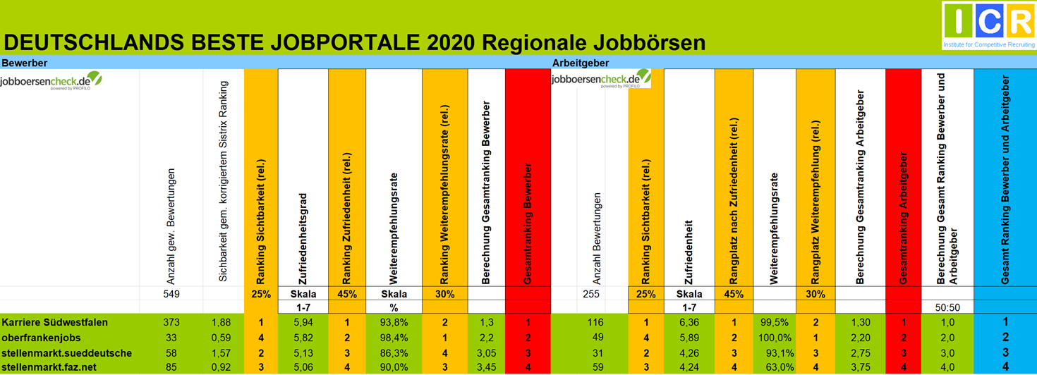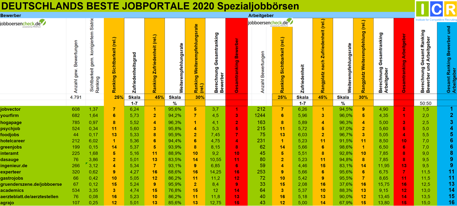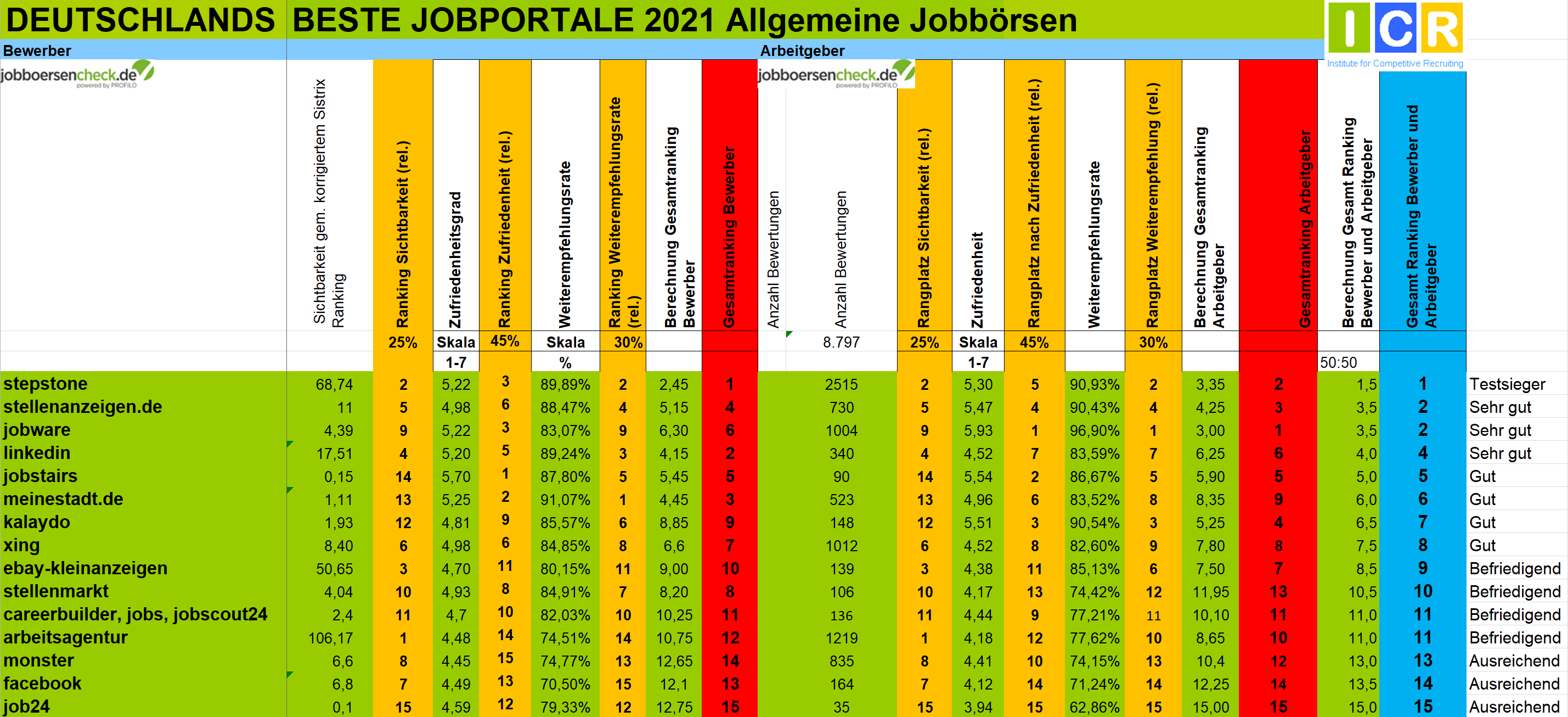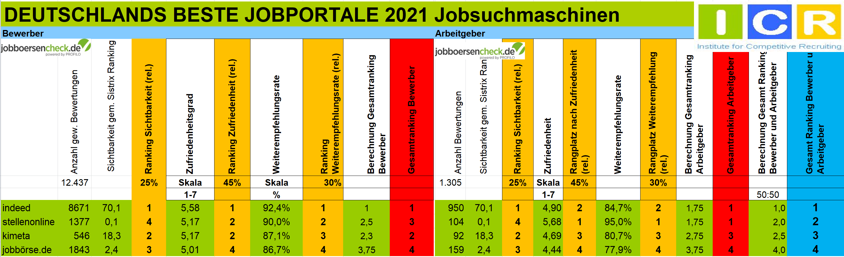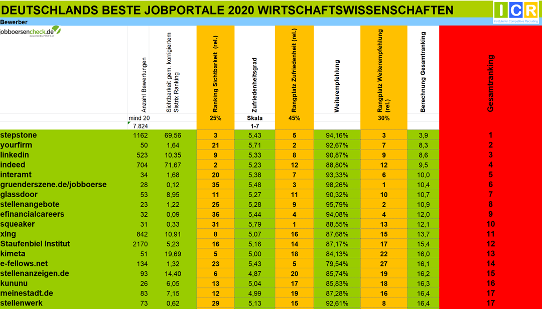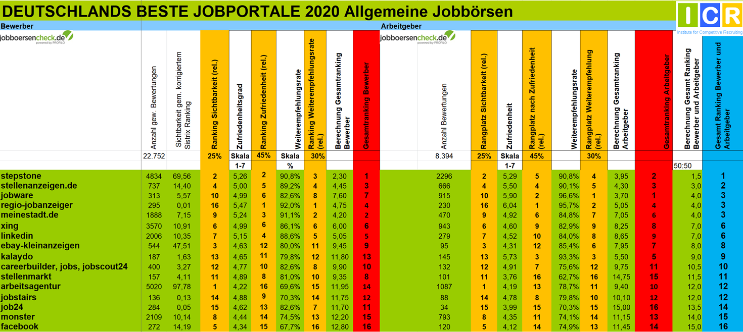 Für das Gesamtranking werden zunächst alle Jobportale mit mehr als 30 Bewertungen (20 bei Berufsfeldern) auf Seiten der Bewerber anhand dieser Kriterien ausgewertet. Dasselbe geschieht auf der Arbeitgeberseite mit allen Jobportalen, die mindestens 30 Bewertungen haben.