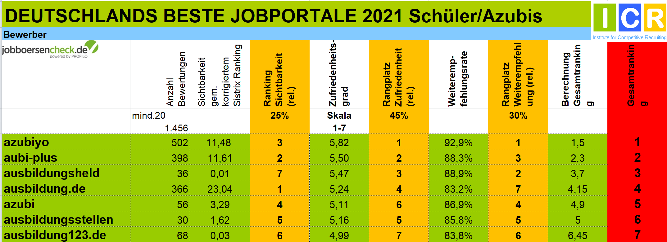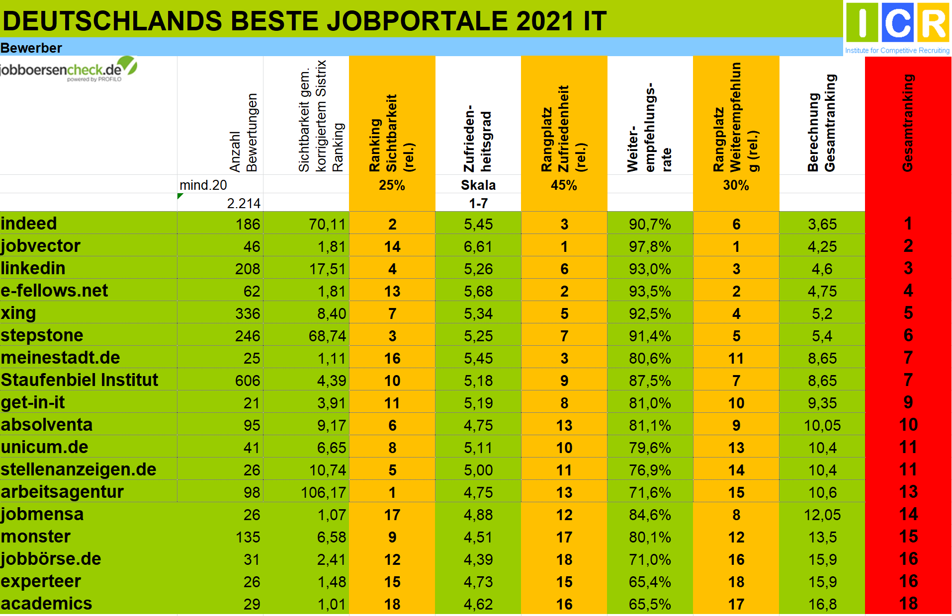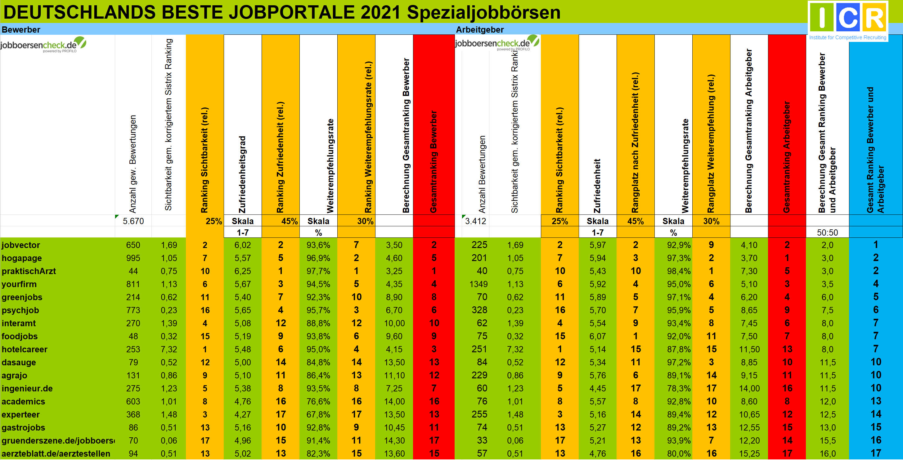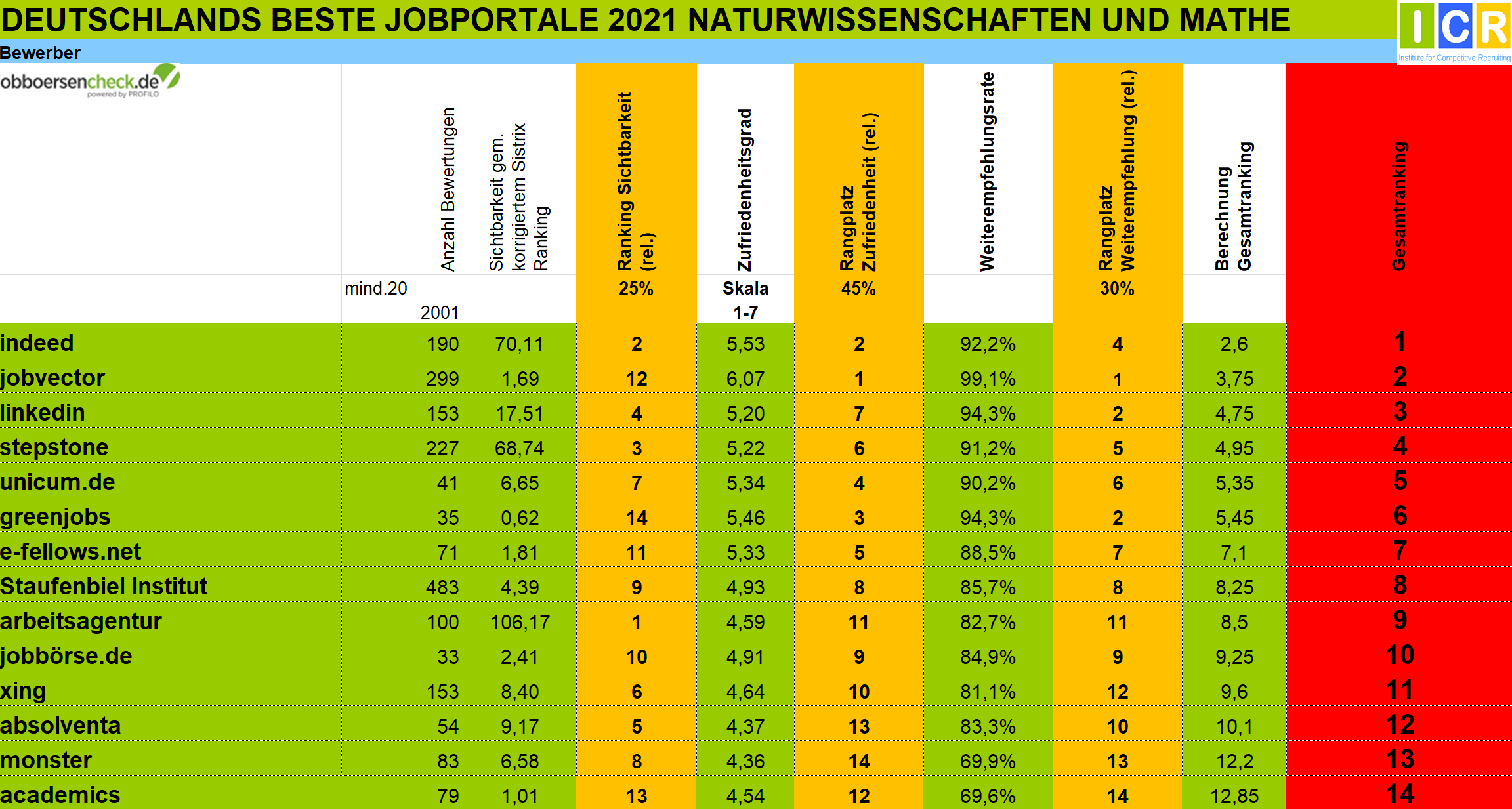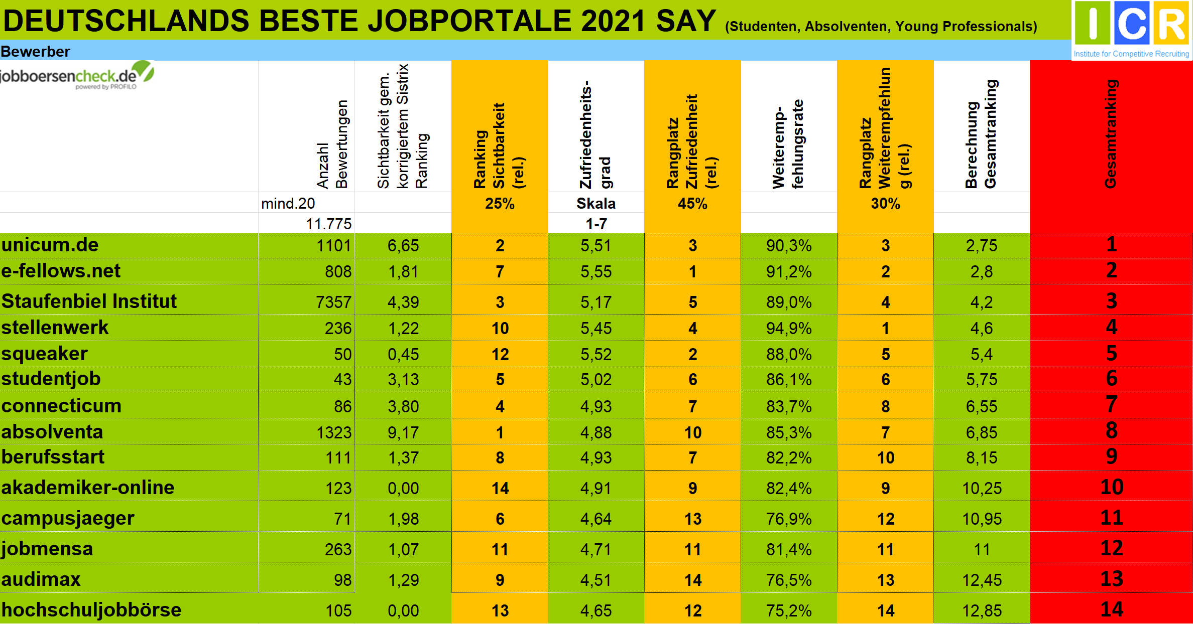 Für das Gesamtranking werden zunächst alle Jobportale mit mehr als 30 Bewertungen (20 bei Berufsfeldern) auf Seiten der Bewerber anhand dieser Kriterien ausgewertet. Dasselbe geschieht auf der Arbeitgeberseite mit allen Jobportalen, die mindestens 30 Bewertungen haben.