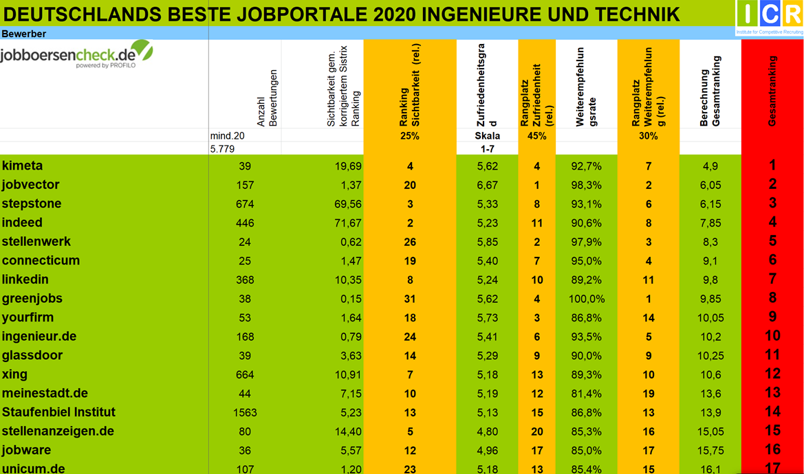 Bei den „Besten Jobportalen für Ingenieure“ kam es gegenüber dem Vorjahr zu deutlichen Veränderungen: Der Vorjahrsieger Jobvector ruschte auf Platz 3, von dieser Vorjahresposition sprang Indeed auf Platz 1, StepStone fiel ganz aus den TOP 3 heraus und wurde auf dem 2. Platz von e-fellows.net ersetzt.