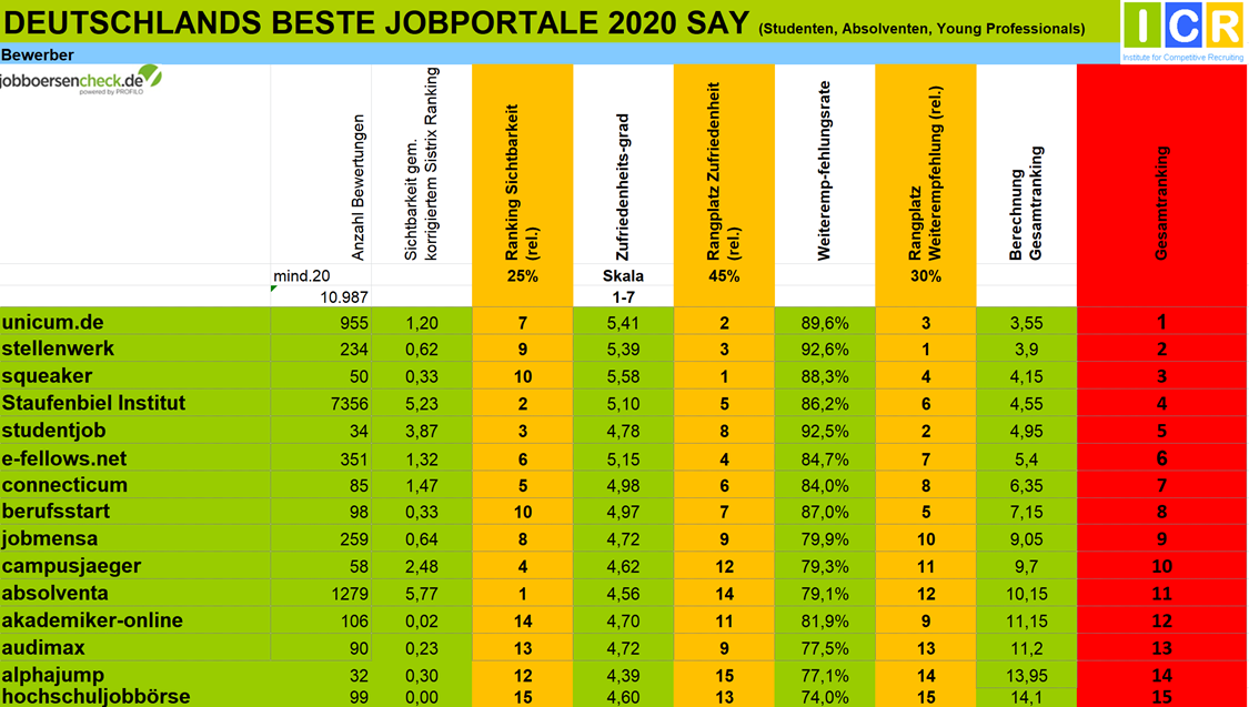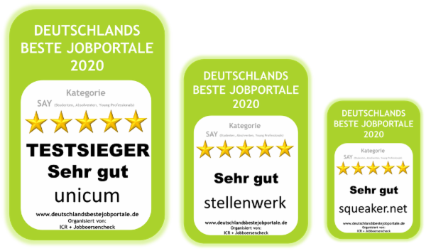 Unangefochtener Testsieger in der Kategorie der besten Jobbörsen für Studenten, Absolventen und Young Professionals ist und bleibt Unicum, und das bereits zum 4. Mal in Folge. Diese Jobbörsen überzeugt auch dieses Jahr Bewerber mit hohen Zufriedenheitsnoten. Das Portal auf dem 2. Platz, wie im Vorjahr, „e-fellows.net“, ist ein Online-Stipendium- und Karrierenetzwerk, welches sich primär an Studenten und Young Professionals richtet. Zu der Vielzahl an Bewertungen hat insbesondere unsere 3. platzierte Jobbörse, das Staufenbiel Institut, beigetragen. Denn insgesamt liegen für dieses Portal über 7.300 Meinungsbilder von Bewerbern vor, welches schon als hervorragendes Indiz der hohen Nutzung von Bewerbern spricht