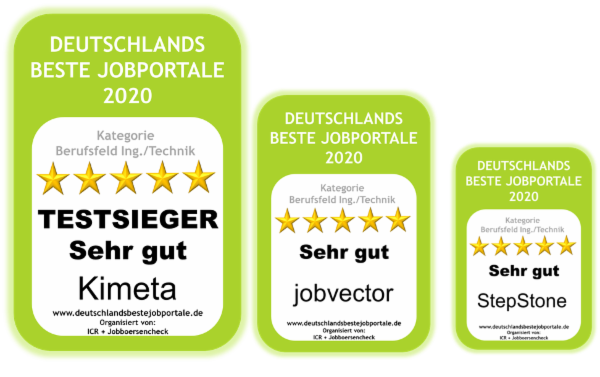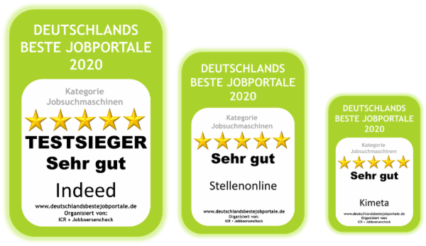 Mußte sich bei den Jobsuchmaschinen Indeed im Vorjahr noch den ersten Platz teilen, konnte Indeed sich 2019 den 1.Platz souverän exklusiv sichern. Indeed glänzt als internationale „Job Site“ mit einem breit gefächerten Angebot für alle Branchen und Berufe. Nach dem Markteintritt in Deutschland und einer erfolgreichen Fernseh-Werbekampagne stiegen Bekanntheitsgrad und die Reichweite stark an. Dies hat sich positiv auf den Platzierungen ausgewirkt. Seit Beginn der Prämierungen erhält die in diesem Jahr zweitplazierte Kimeta Jahr für Jahr eine Auszeichnung, oft auch als Testsieger. Nur im letzten Jahr rutschte Kimeta auf den undankbaren 4. Rangplatz. Dieses Jahr kommt sie wieder zurück und sichert sich gemeinsam mit stellenonline.de den 2. Rangplatz. Auf dem 3. Platz landete gigajob.