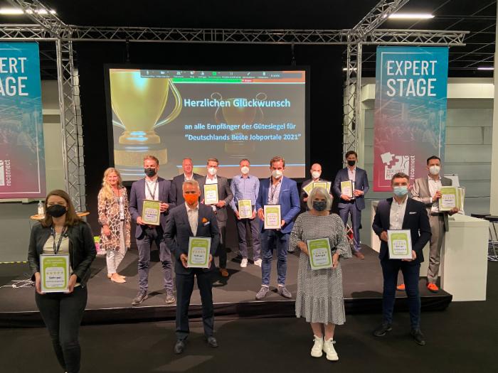 Mehr als 67.000 Bewerber und über 18.000 Arbeitgeber haben ihre Erfahrungen geteilt und damit als Jury die Basis für die renommierten Gütesiegel „Deutschlands beste Jobportale 2021“ gebildet. Auf der diesjährigen, erstmals wieder live durchgeführten, HR-Leitmesse „Zukunft Personal Reconnect“ wurden im Rahmen des „Future of Recruiting Summits“ die Gewinner-Jobbörsen offiziell ausgezeichnet. Das freudige Lächeln war dieses Mal etwas schwieriger zu erkennen.