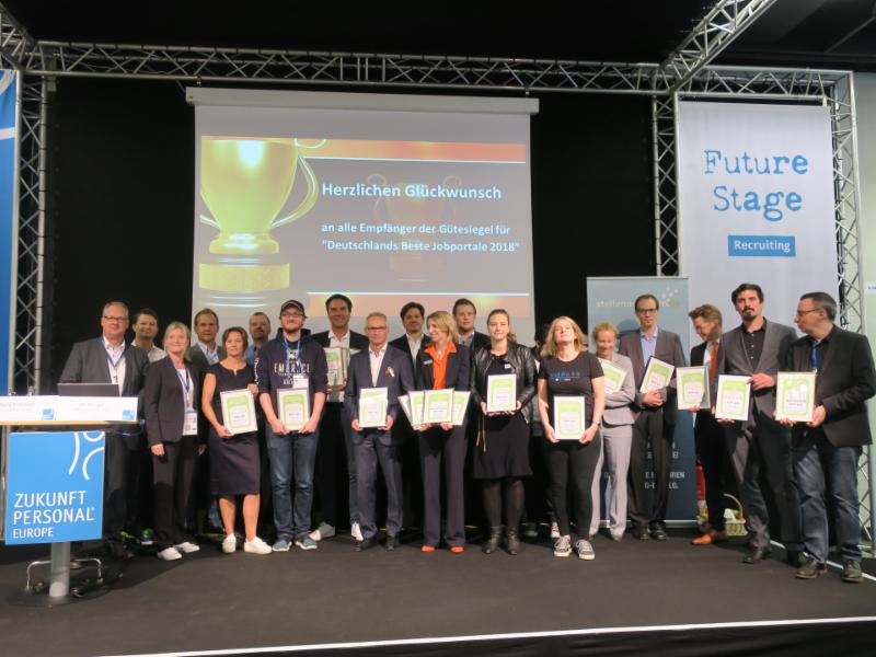Mehr als 31.500 Bewerber und über 11.500 Arbeitgeber haben ihre Erfahrungen geteilt und damit als Jury die Basis für die renommierten Gütesiegel „Deutschlands beste Jobportale 2018“ gebildet. Auf der diesjährigen HR-Leitmesse „Zukunft Personal Europe“ in Köln wurden im Rahmen des Future of Recruiting Summits 2018 die Gewinner-Jobbörsen offiziell ausgezeichnet.