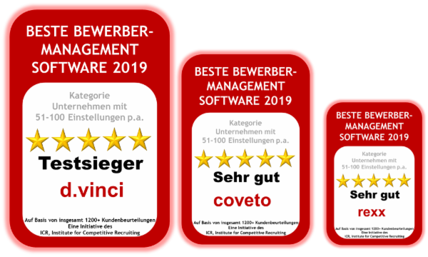 Mehr als 1200 Kunden von Bewerbermanagementsystem-Anbietern (u.a. SAP E-Recruiting, d.vinci, rexx, Taleo (Oracle), Successfactors, eRecruiter, Persis, Haufe ( Umantis ), Beesite (Milch&Zucker), Talentlink Lumesse, Peoplesoft, P&I LOGA, Concludis, Coveto, Prescreen) haben für den 2019 /2020 er Report, im Detail eine Beurteilung über die von ihnen genutzte Lösung zum Management von Bewerbern abgegeben. Darüberhinaus haben Sie die Funktionalitäten beurteilt und auch deren Wichtigkeit für die tägliche Nutzung angeben.