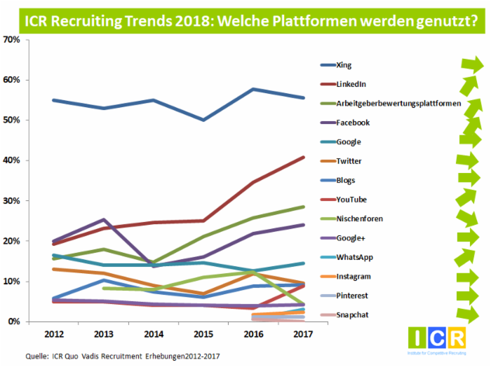 Dies sind nur einige der Ergebnisse aus den ICR Recruiting Trends 2018. Basierend auf mehr als 6 Jahren (2012-2017) Recruiting Studien kann das ICR exklusive Informationen und Trends zum Thema Recruiting aufzeigen. Jedes Jahr wurden mehr als 10.000 Unternehmen aller Größenklassen und Branchen befragt, wo die Reise im Recruiting hingeht. Die Beteiligung der Arbeitgeber liegt in den Jahren 2012-2017 zwischen ca. 500-900 aller Unternehmensgrößen und vieler Branchen, so daß die Untersuchungen auf einer breiten Basis stehen.