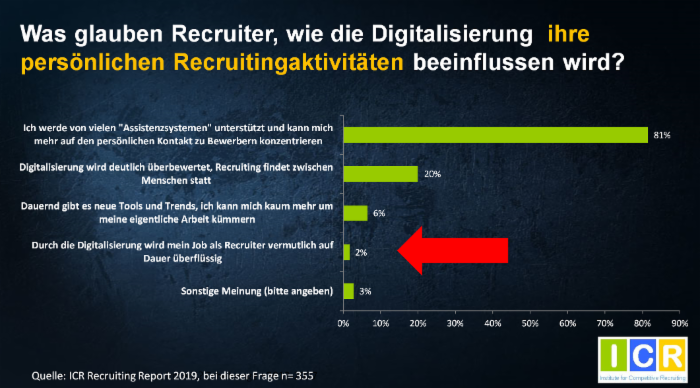 Wenn man sie heute fragt (was das ICR bei 300+ Recruitern getan hat), dann hat nur jeder 50te Recruiter (2%) Sorge um seinen oder Ihren Job. 4 von 5 Recruitern sehen ihre Zukunft eher rosig und gehen davon aus, daß sie von vielen Assistenzsystemen unterstützt werden und sich dann mehr auf den persönlichen Kontakt zu Bewerbern konzentrieren können.