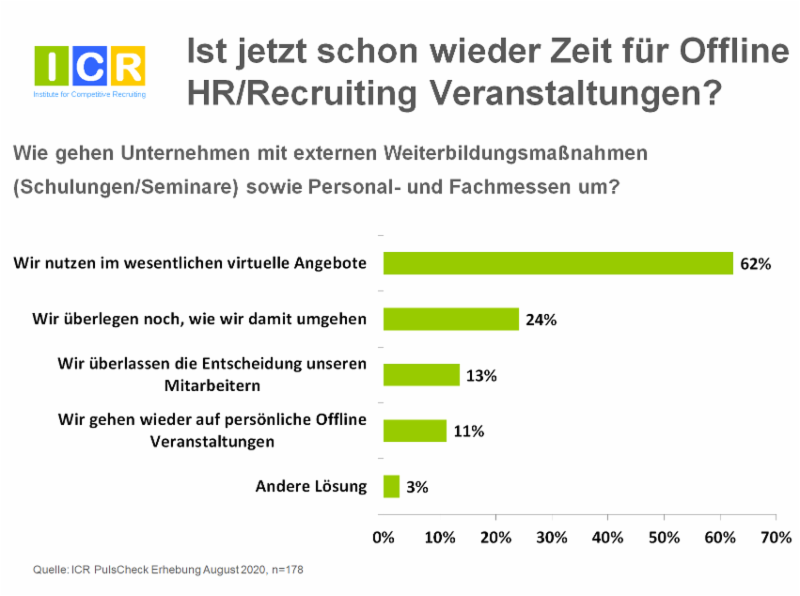 62% der teilnehmenden Unternehmen nutzt im wesentlichen nur virtuelle Angebote für Seminare, Schulungen oder Fachmessen. 24% überlegt im Moment noch, wie sie in der Corona Krise damit umgehen sollen. 13% überläßt die Entscheidung den eigenen Mitarbeitern und nur 11% gehen wieder auf persönliche Offline Veranstaltungen.