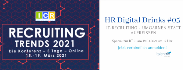 Und im Anschluß an den 3. Tag der ICR Recruiting Trends 2021 Konferenz Online gibt es ab 17.00 Uhr die "Digital Drinks", einen Tagesausklang in Kooperation mit Annemarie Zoppelt von Talentrix zum Thema "IT-Recruiting - umgarnen statt aufreissen".