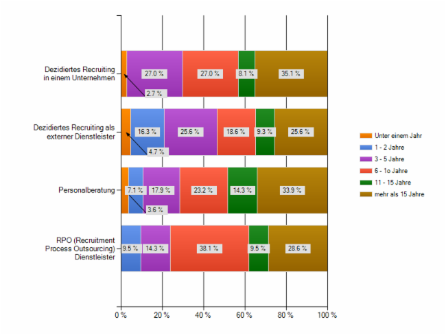 Signifikante Unterschiede in der allgemeinen Berufserfahrung bei der Betrachtung aller vier Tätigkeitsbereiche für Recruiter sind im Durchschnitt nicht zu erkennen, der mit etwa 8-10 Jahren auf gleichem Niveau liegt. Auch bei der bei der Betrachtung der durchschnittlichen Recruitingerfahrung aller vier Tätigkeitsbereiche für Recruiter liegt die Spanne mit 5-7 Jahren eng bei einander. Die signifikanten Unterschiede zeigen sich wieder in der jeweiligen Zusammensetzung. Insbesondere Recruiter mit unter einem Jahr Berufserfahrung sind bei allen außer im RPO Bereich zu finden. Eine Tätigkeit im RPO Bereich ist daher ohne vorherige Recruitingerfahrung offensichtlich nicht möglich. Beim Segment der Recruiter mit 3-5 Jahren Berufserfahrung weisen das Tätigkeitsfeld Inhouse-Recruiting einen fast doppelt so hohen Anteil auf wie alle anderen Tätigkeitsfelder. Beim Segment 6-10 Jahre Berufserfahrung ist das Bild gemischter: Hier führen der RPO Bereich und die Tätigkeit im Inhouse Recruiting die Liste knapp vor der Personalberatung und Vermittlung an. Recruiter mit 11-15 Jahren Berufserfahrung trifft man am häufigsten in der Personalberatung an.