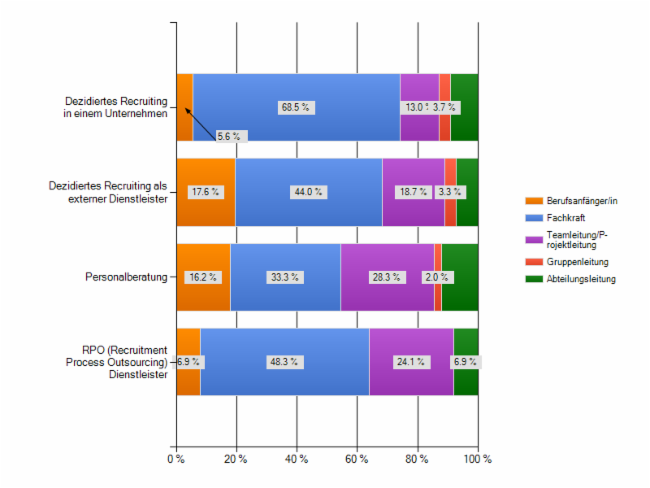 Bei dieser Grafik zeigen sich einige Auffälligkeiten: Bei Personalvermittlern und Personalberatungen sind zwei bis dreimal so viele Berufsanfänger tätig wie bei im Inhouse oder RPO Bereich. Dafür sind in letztgenannten deutlich mehr auf dem Karrierelevel Fachkraft aktiv. Die Führungsspannen scheinen im RPO und Personalberatungsbereich kleiner zu sein, da dort prozentual deutlich mehr Personen auf dem Level Team-/Projektleitung aktiv sind als in den anderen Tätigkeitsfeldern.